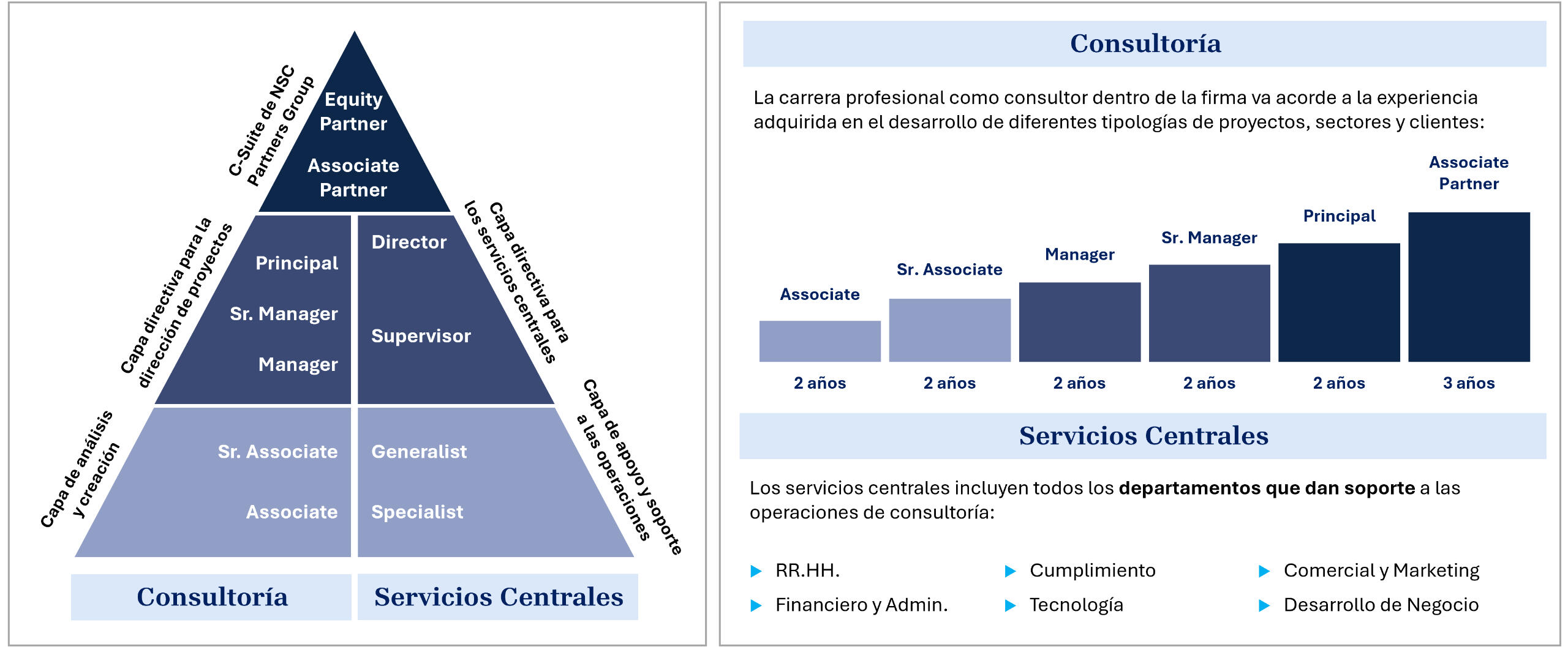 Associate y Senior Associate: Ejecutan tareas analíticas y colaboran con equipos senior para tener una visión global del proyecto. También desarrollan skills de gestión de equipos e interacción con el cliente.